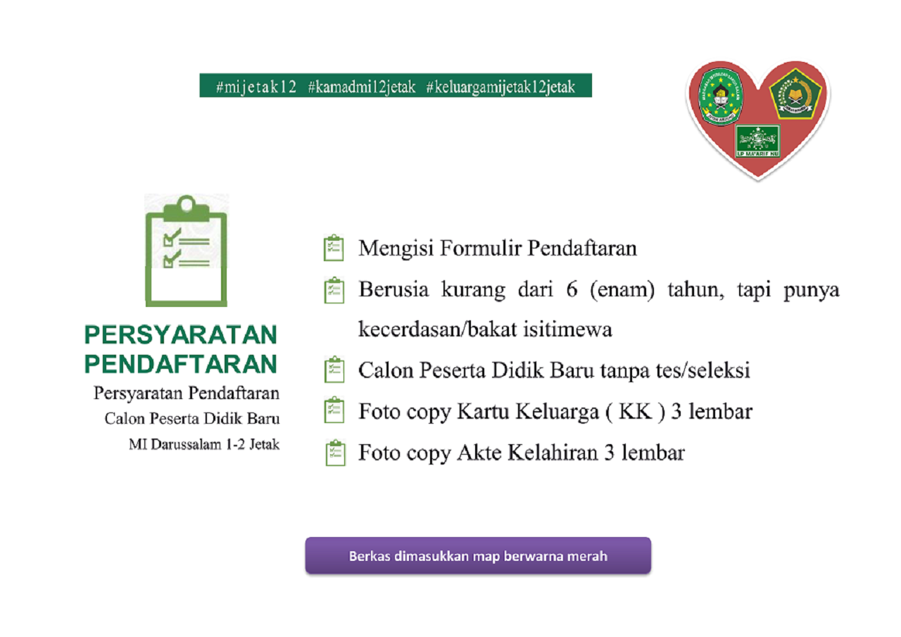 MI DARUSSALAM 1-2 JETAK menyediakan PMB secara online diharapkan proses PMB dapat berjalan cepat dan bisa dilakukan dimanapun dan kapanpun selama sesi PMB Online dibuka. Proses pendaftaran calon murid baru tidak usah datang ke madrasah langsung, bisa mengakses website PMB Online MI DARUSSALAM 1-2 JETAK.